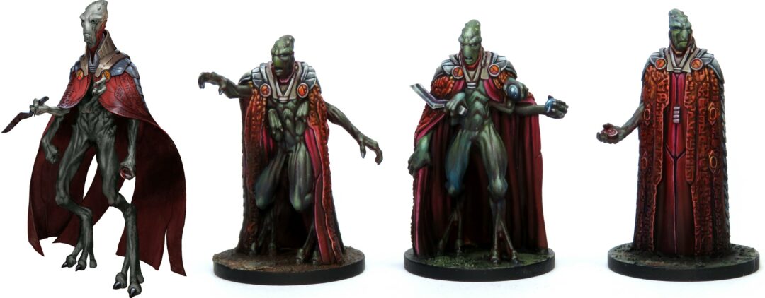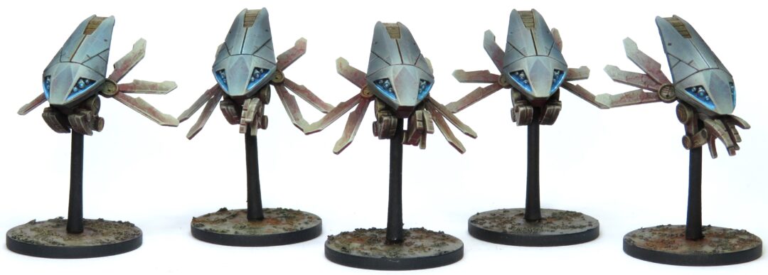 The Talos (second from left) are humanoid machines comprised of a crystalline rock structure similar to the walls of the asteroid habitats. They are armoured and able to regenerate from damage. Their weapons are integrated into their bodies and include plasma and heat as well as neurological attacks. Referred to as ‘Sentinels’ by the intruders, their only purpose is to attack on sight.