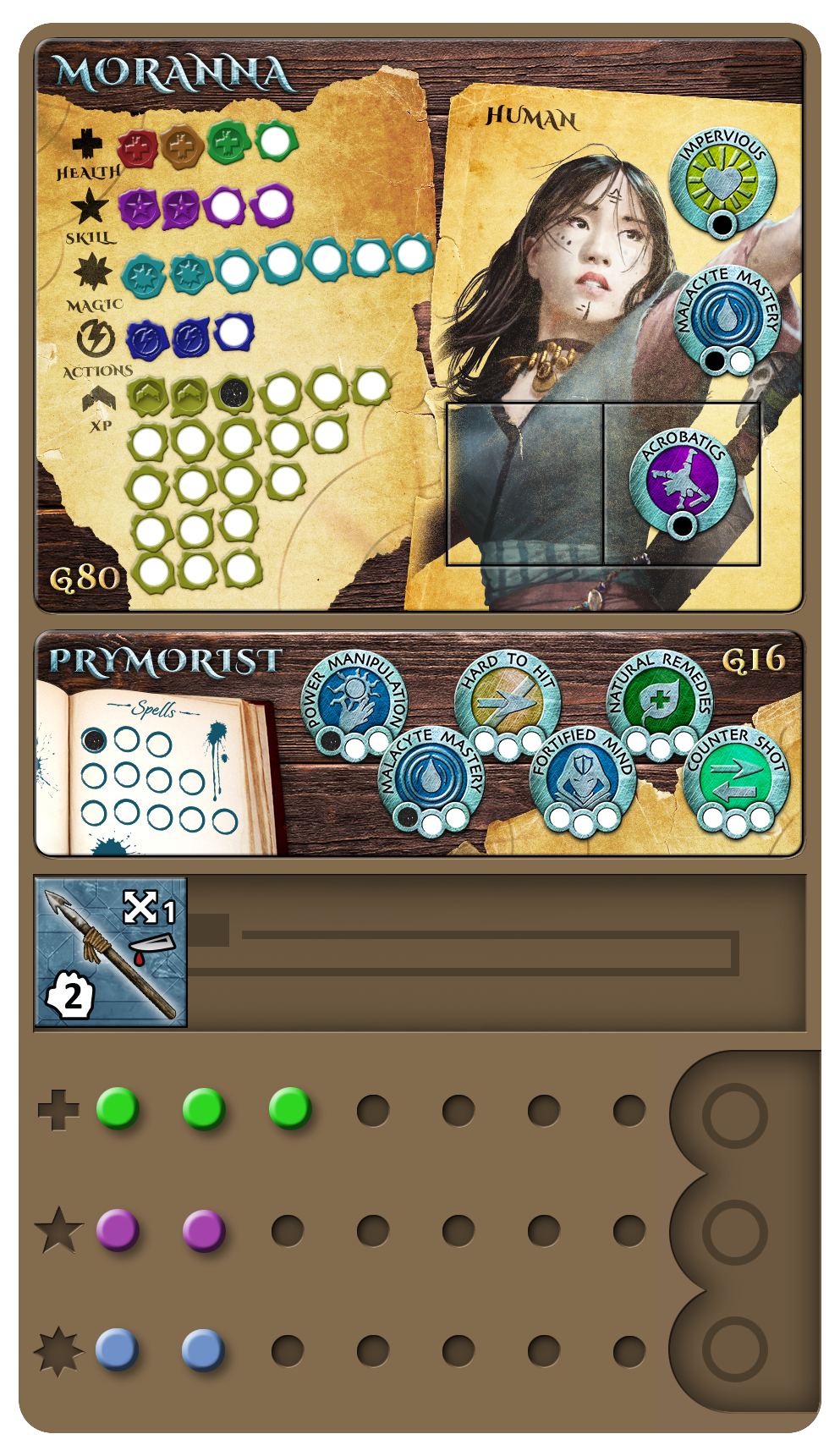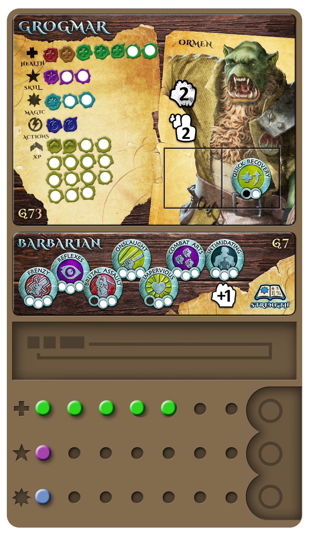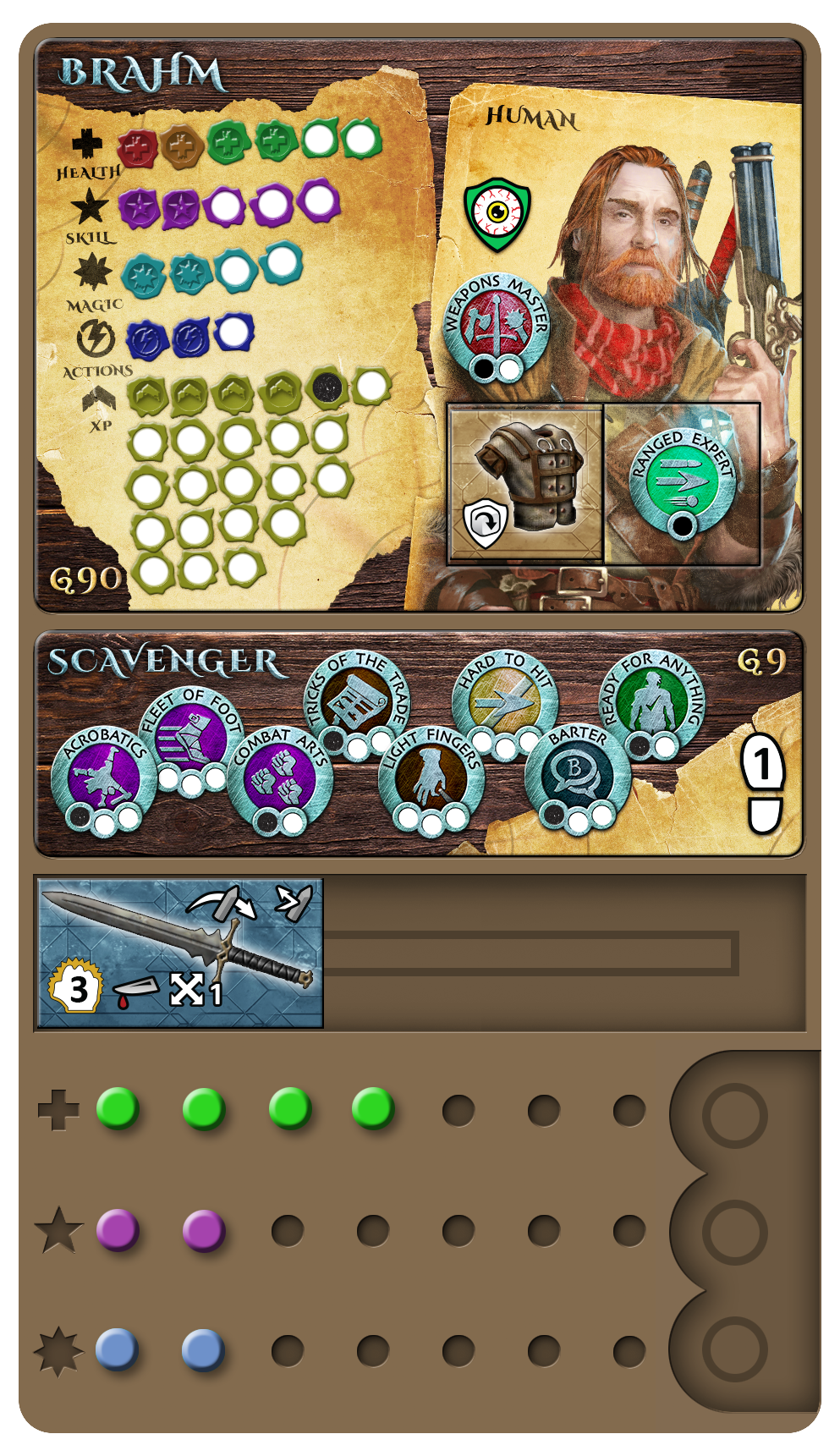 Along with his magnificent weapon, John also escaped with an experience point. Leading to him putting a skill point into “Ready For Anything”. This granting Brahm the ability to spend a skill peg at any time and then take an action.