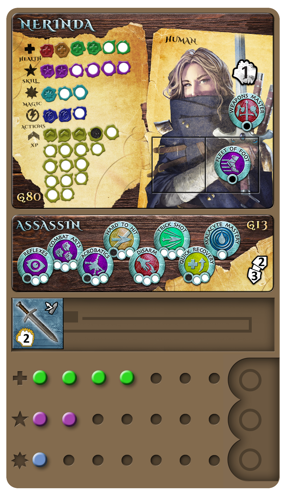 With that in mind, Nerinda getting out of the dungeon safely and making back to town means that she gets a mark in her XP tracker. James has chosen to take a level in “Hard to Hit”, now giving Nerinda the ability to avoid being affected by ranged attacks whilst in cover. Chosen more as it felt like the next logical choice, thematically, for James’ build of Assassin Nerinda.