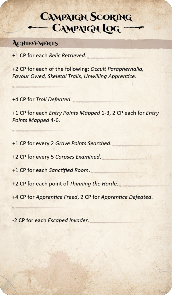The Maladum Dungeons of Enveron campaign comes with a campaign log to keep track of important information as you progress through the story. As it happens, this also makes for a useful tracker to see how well you are doing overall.