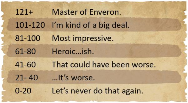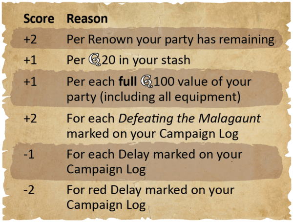 Below you will find a scoring system that uses the campaign log (and a few extra bits of information) to determine just how mighty your band of Adventurers truly are.