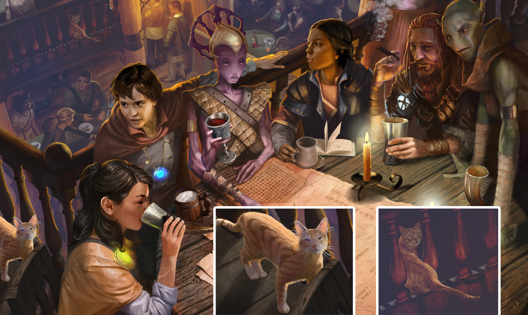 Also, there’s often a difference of opinion. Colin didn’t want certain animals such as dogs or horses to exist in Maladum as he felt it took away from the fantasy, in the same way it would if there were dogs or horses in Star Wars. I disagreed, the gene farms of Mesa would have allowed for dogs and horses as well as any host of alien creatures. We eventually settled on hybrid animals, no Earthly dogs or horses were allowed but analogues would be acceptable, so instead of horses we would have alien mounts. Meanwhile, Nick, our artist, was completely oblivious to our creative bickering and painted a couple of normal house cats into the artwork of Ale and Adventure, making them canon!