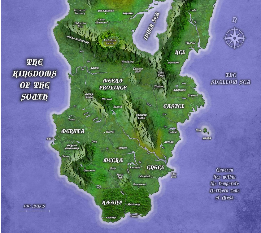 A territory that is not disputed lies central in the Meera Mountains. Neither Khaara or Meera Province, the two kingdoms bordering it, have laid claim, the locals don’t even like to look upon it thinking it cursed. This is the Forbidden Lands, where no man or Kindred creature dwells. (This falls outside of my remit of geopolitics as there is no power play here but indulge me a moment as the Forbidden Lands are unique to Enveron and worth an armchair visit!)