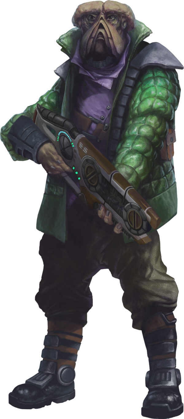 Lohbac is a captain without a ship or crew after a recent encounter with the Purge. He is from an inhospitable world that has huge oceans and rocky islands and although he has gills he can’t actually breathe underwater, the gills are just evolutionary remnants. He can breathe the standard air in Human habitats but wears a re-breather that gives him a regular whiff of nitrogen. He also has to regularly rub unguents onto his skin to stop it from drying out. He is stronger than the average Human and enjoys the occasional bar fight.