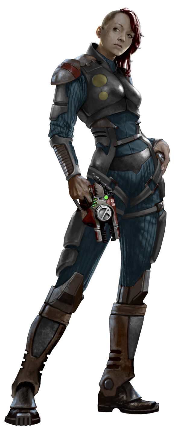 Special Agent Zara has been commissioned by the Galactic Corps to be their eyes and ears on developments in the First Born system. She has posted herself at Trading Post 5, and spends her days pretending to drink at the bar but observes all. The local riff raff avoid her although they are aware she has no interest in their petty criminal activities. Daric tolerates her presence as it never hurts to have a well armed militia on hand.
