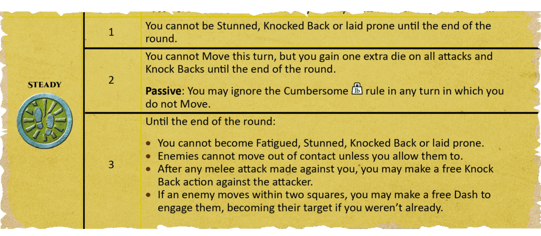 Role: While the first three roles are focussed on one aspect of party life, support characters are the classic “jack-of-all-trades” types. In Maladum these characters have a large Skill statistic so that they can perform a variety of useful tasks that are not necessarily combat focussed such as Barter, Distraction, Persuasion. Or specific combat feats such as Disarm or Trick Shot which are less about dealing damage and more about combat utility.