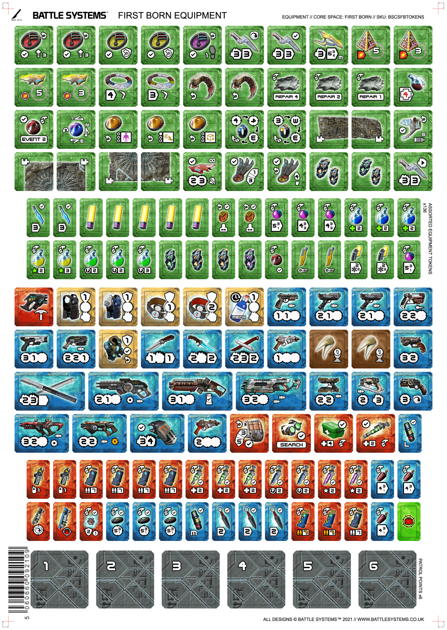 A single sheet of equipment tokens and Patrol Points, identical to those in the First Born Starter Set. It is not required to play, but the extra Patrol Points will be useful if playing on larger setups, or if you want more equipment available to purchase in the Trade Phase.
