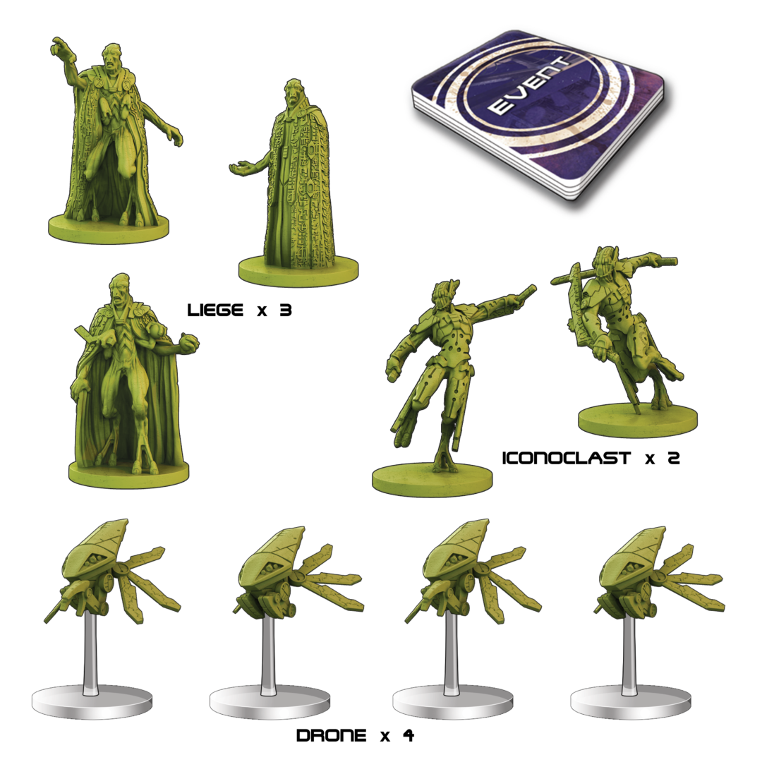 Raise the ante with this booster pack of extra First Born. The imperious Liege, the combat-focused Iconoclast and the patrolling Drones are here to make your life harder! These are perfect for larger games or just when you want more of a challenge, and the new Event Cards will seamlessly integrate them into your missions.