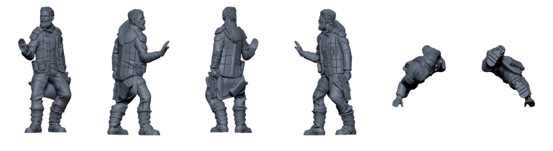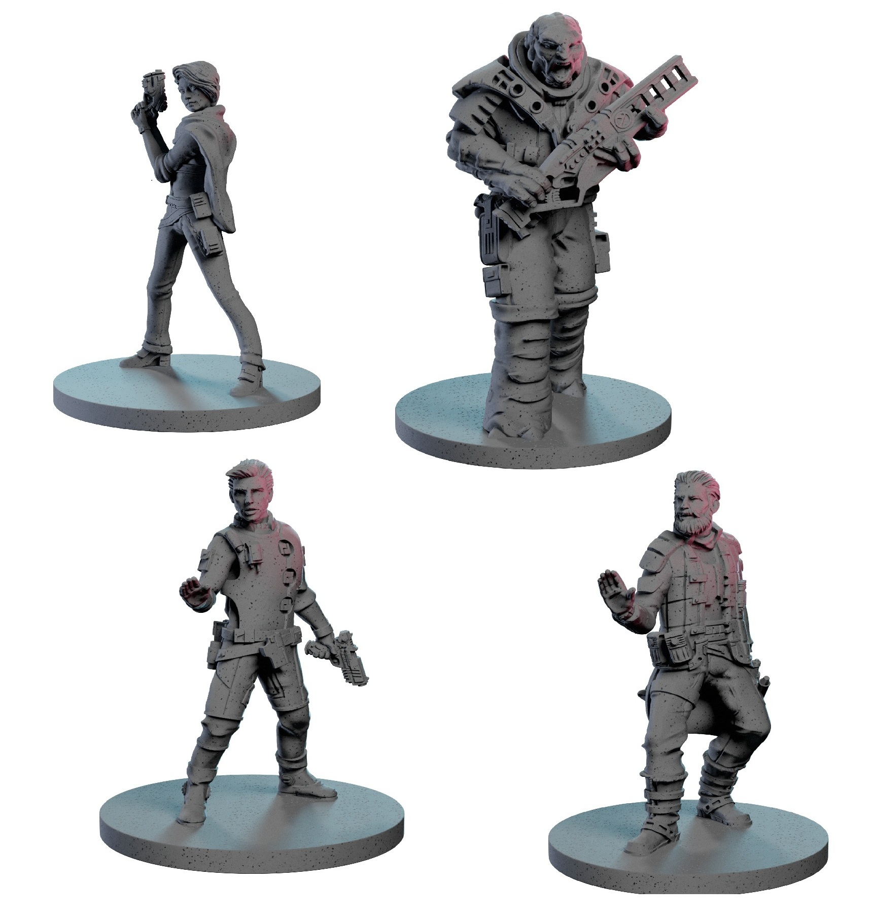 3D printable files of the four sci-fi mercenary miniatures from the Ion Hope Crew from the Core Space Starter Set. It includes all the components for free!