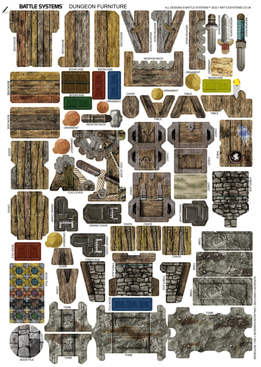 This pack accessorises any dungeon with classic furniture and scatter terrain, from simple tables and chairs, to bookcases filled with arcane lore, to racks of deadly weaponry. You’ll also find chests, crates and tombs ready to be looted and mysterious levers to be pulled, and when all is said and done you can relax by the fire…