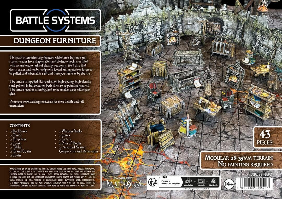 This Dungeon Furniture set accessorises any dungeon with classic furniture and scatter terrain, from simple tables and chairs, to bookcases filled with arcane lore, to racks of deadly weaponry.
