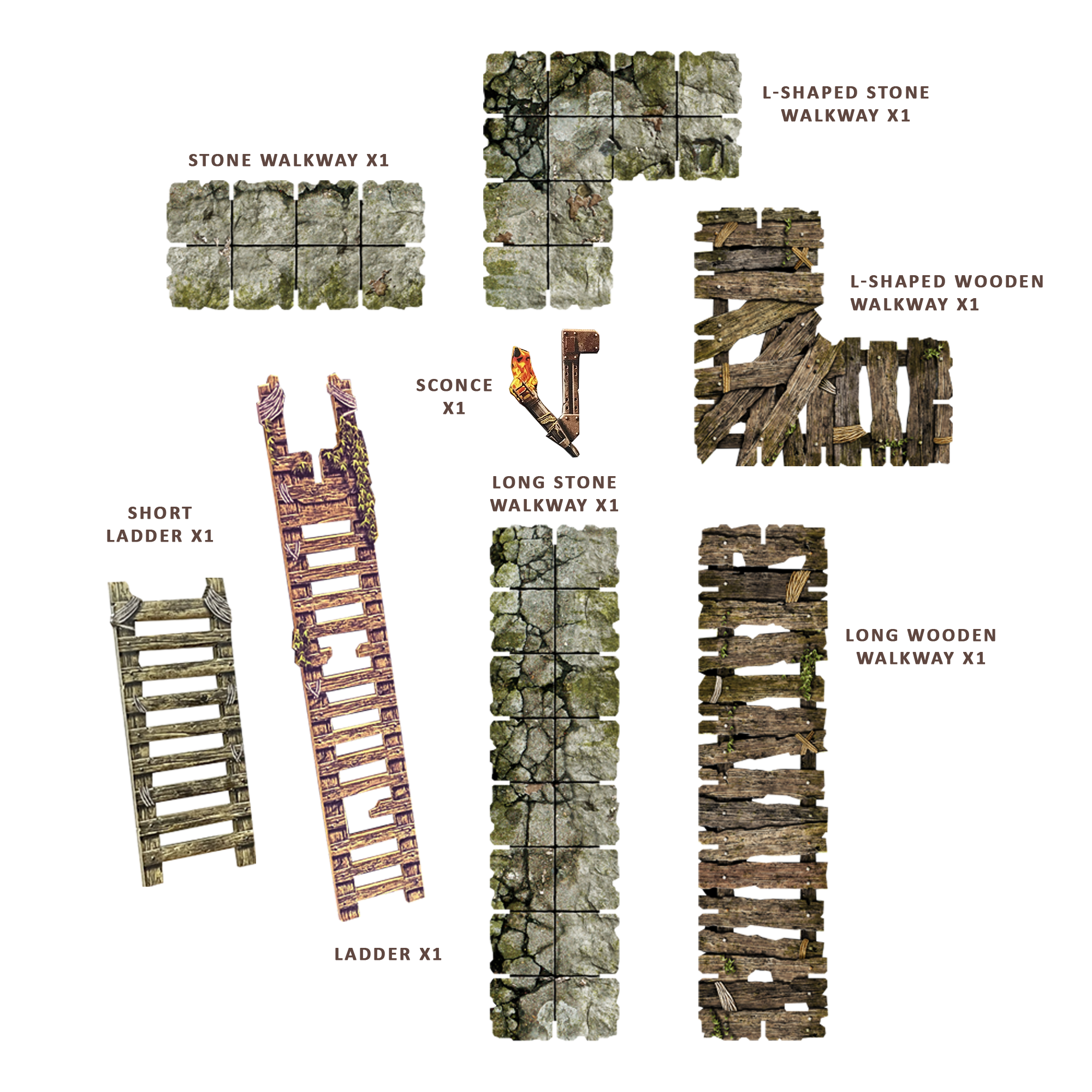 This pack contains additional walkways from the Fantasy Dungeon terrain set for building larger gaming areas.