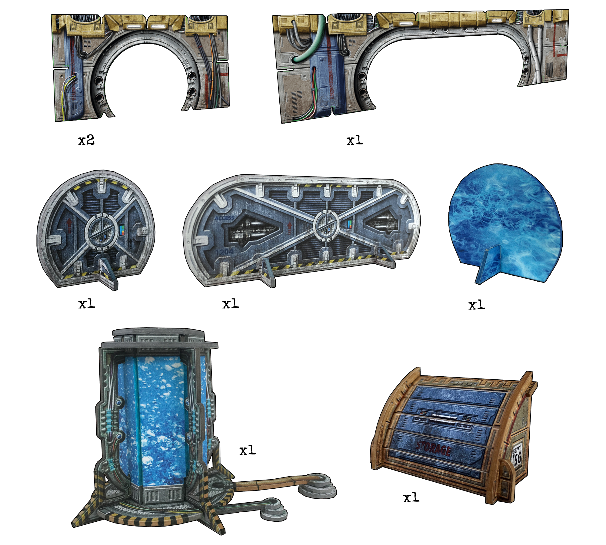 This pack contains additional doorways and accessories from the Frontier Core Set for building larger gaming areas.